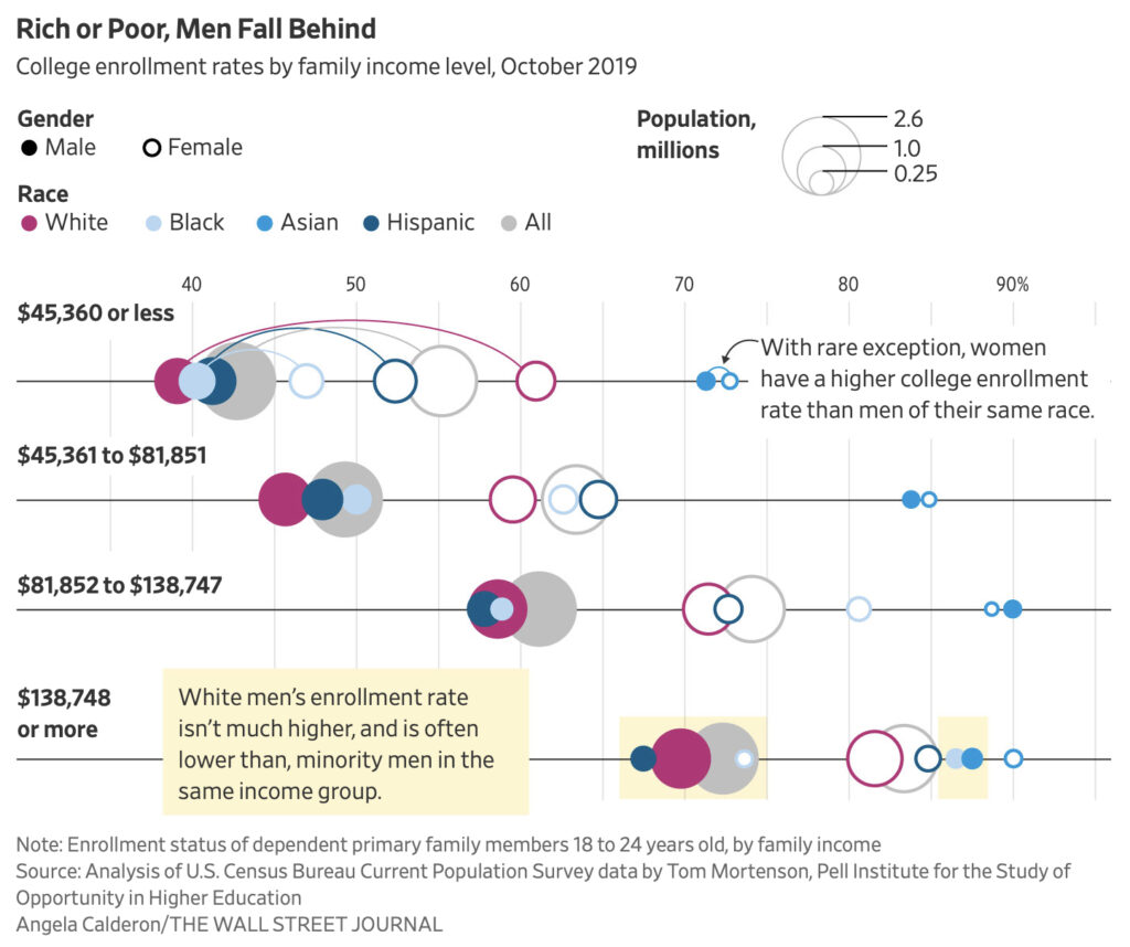 The September 7th front page of the Wall Street Journal featured an article built around analytics of US college attendance by sex, race and income level.